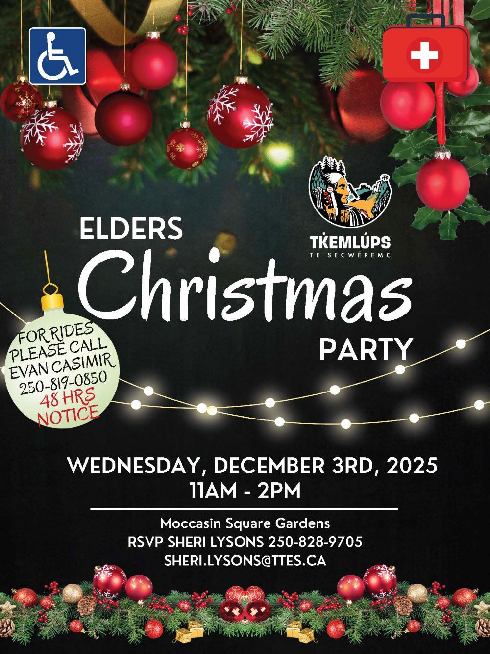 Please join us Wednesday, December 3, 11:00am-2:00pm for the Annual TteS Elders Luncheon at Moccasin Square Gardens which is handicap accessible. We’ll have a Turkey Lunch, A Little Entertainment, and Pictures with Santa. For Rides Please call Evan Casimir, Essential Service Driver, at Least 48 hours in Advance at 250-819-0850. First aid attendant will be onsite